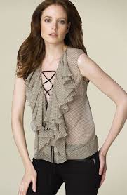 Designer Robbi & Nikki let their imagination run wild when creating this superb ruffle tank and as a result, this one of the kind, super hot low cut is a total knockout! Made of sheer chiffon with crisscross cleavage style, we adore the cute dot prints and the silky feeling.